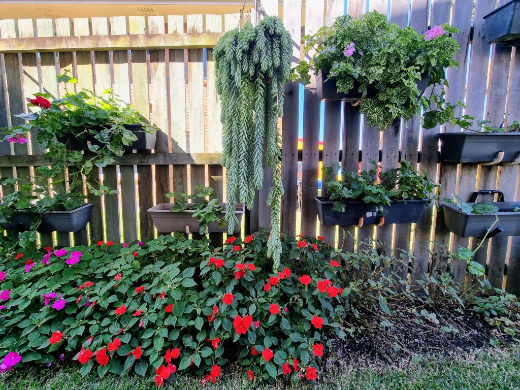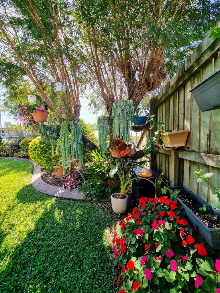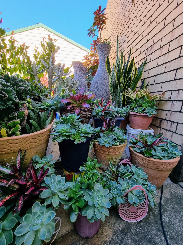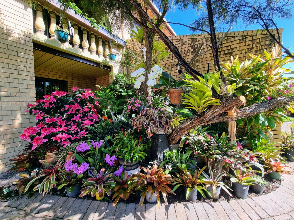 This suburban garden is full of potted plants including a large variety of exotic and colourful bromeliads, geraniums and seasonal annuals.