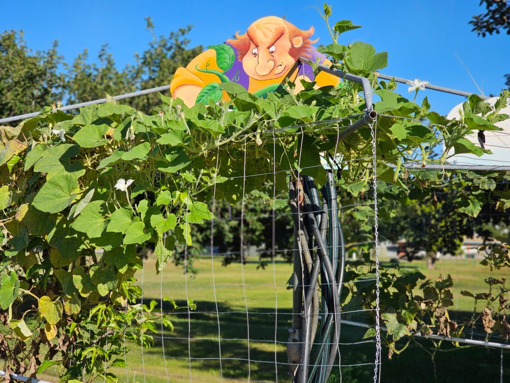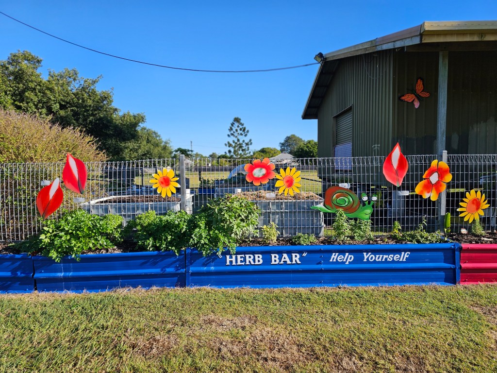 ‘Jack and the Bean Stalk’ art theme sets a whimsical tone, with the ‘giant’ overseeing the garden. A recycled clothes hoist frame sits majestically for the hanging garden and colour abounds throughout.
