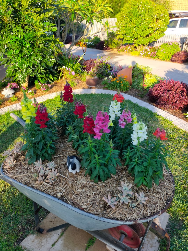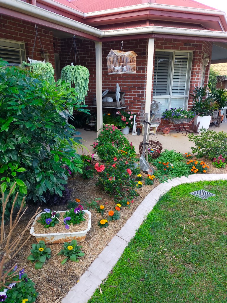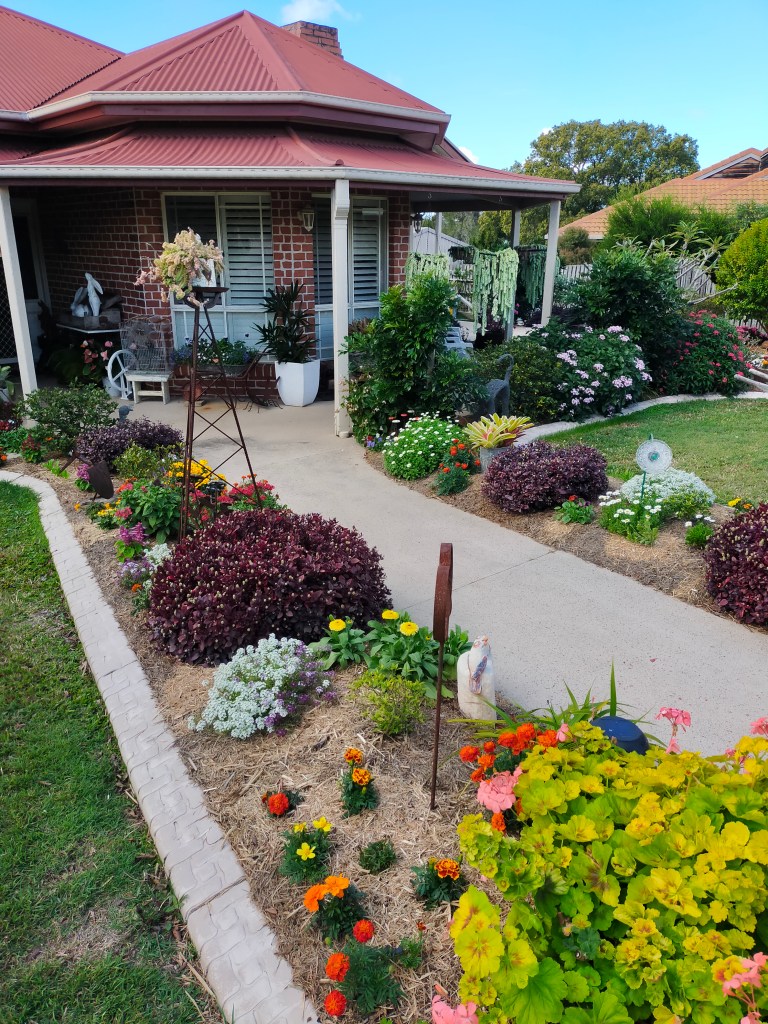 Colour and quirkiness abounds in this garden. A garden path bordered with brightly coloured and fragrant flowers is a delightful welcome for garden visitors.