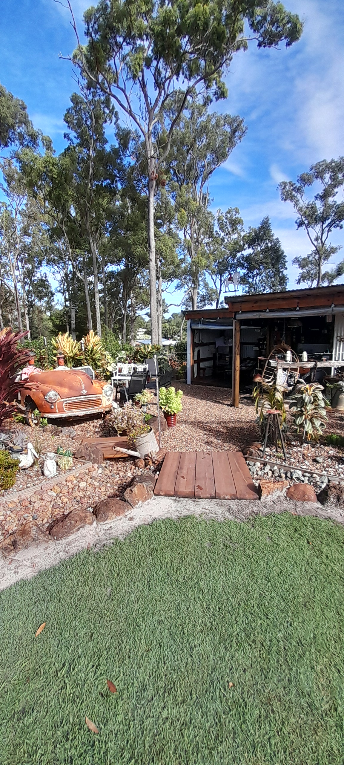 Many features of this garden are a dry creek bed, an outdoor cook house and a fire pit, the old Morrie, a truck bar and shadehouses.
