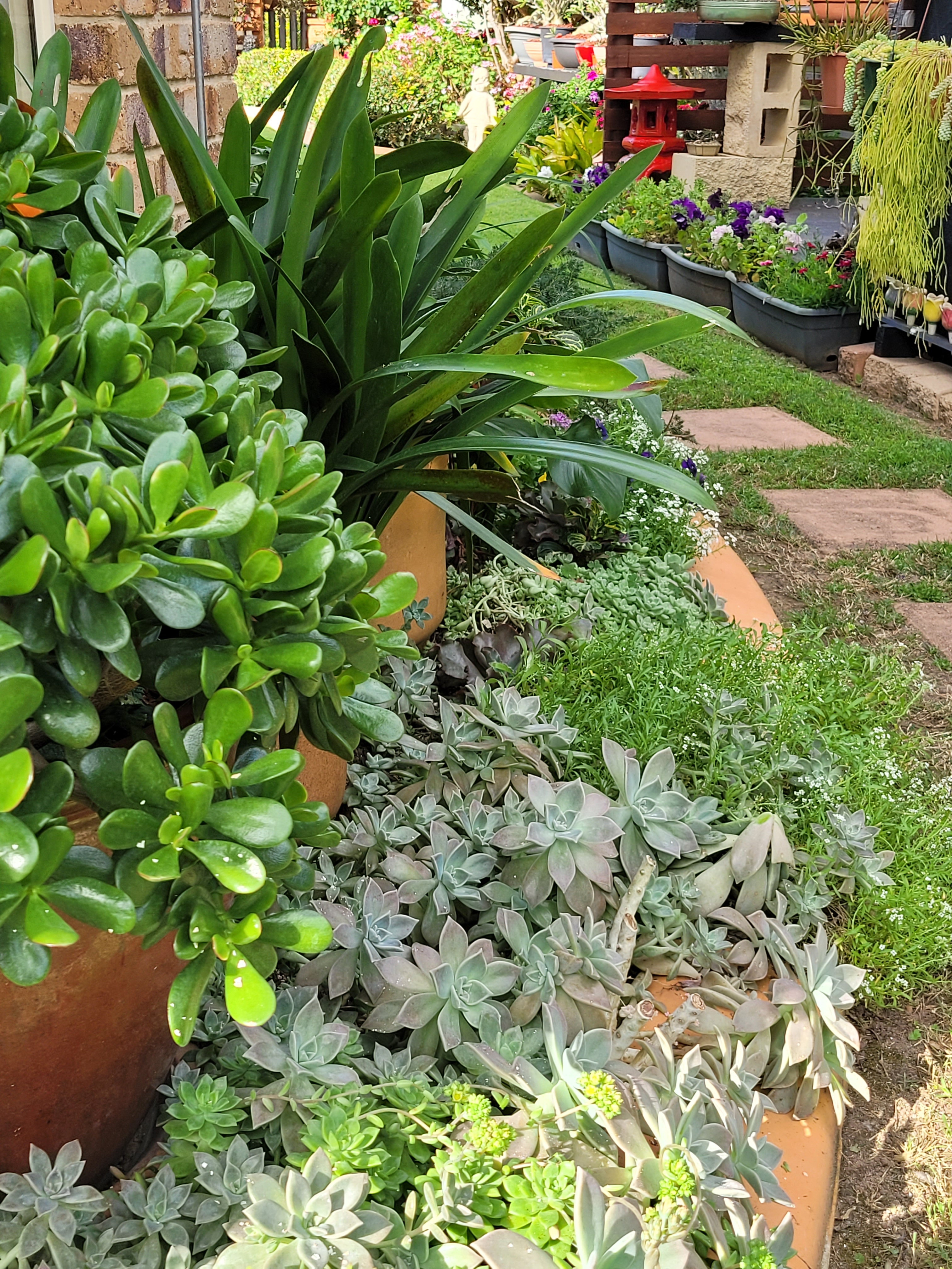 Healthy citrus trees, magnolias and feature shrubs dominate the borderline of the property. Spring annuals, coleus and pottery pieces provide a riot of colour throughout the garden.