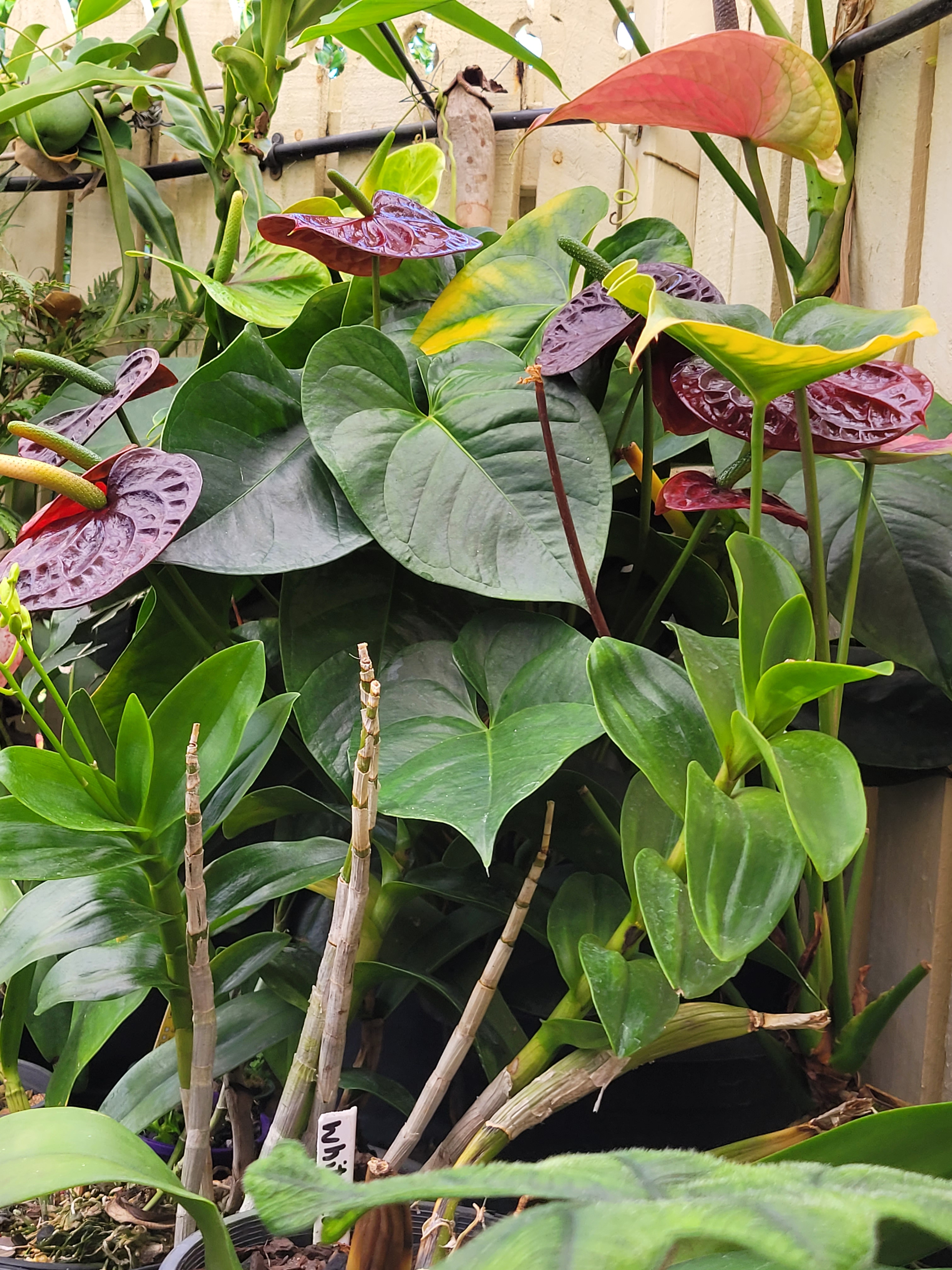 The greenhouses are packed with begonias, orchids, indoor plants and ferns. A wall feature showcasing a series of clay hanging pots made by the owner with various succulents is a new addition.