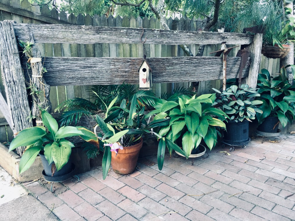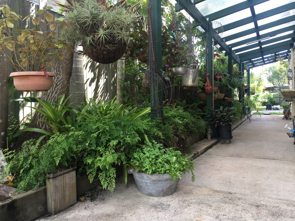 The garden has a variety of established trees, vegetable plantings and hanging baskets to provide a passage of discovery.