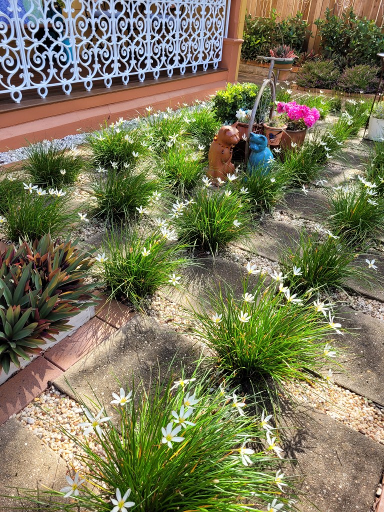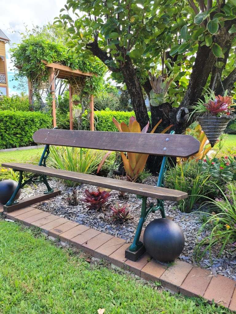 Newly planted shrubs, flowers and trees are bursting with growth. Replanted hedges of Murraya and Gardenias are now established – defining the sections of the garden areas. The heavily trimmed Persimmon and Frangipani have progressed well supported by luscious new garden beds beneath.