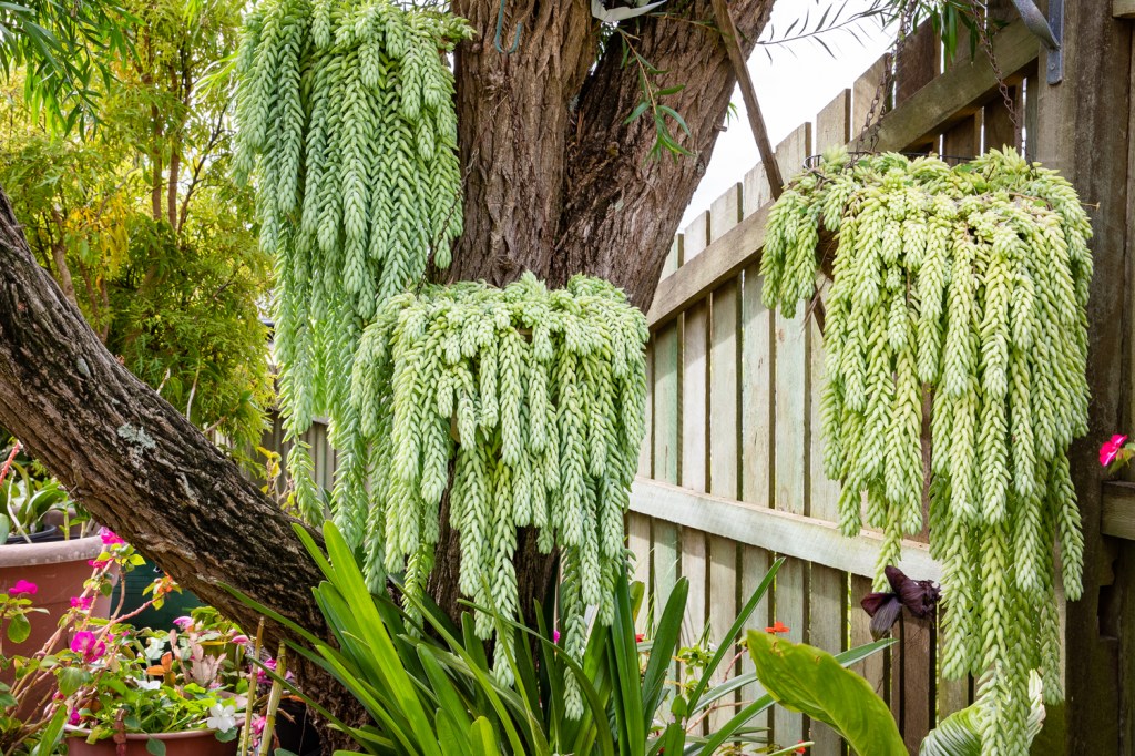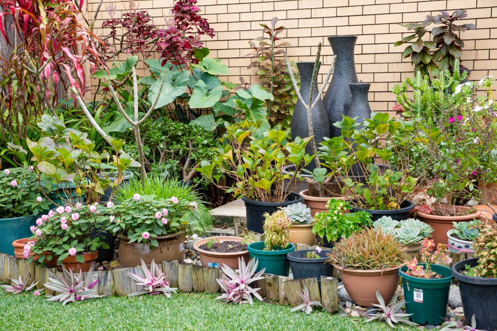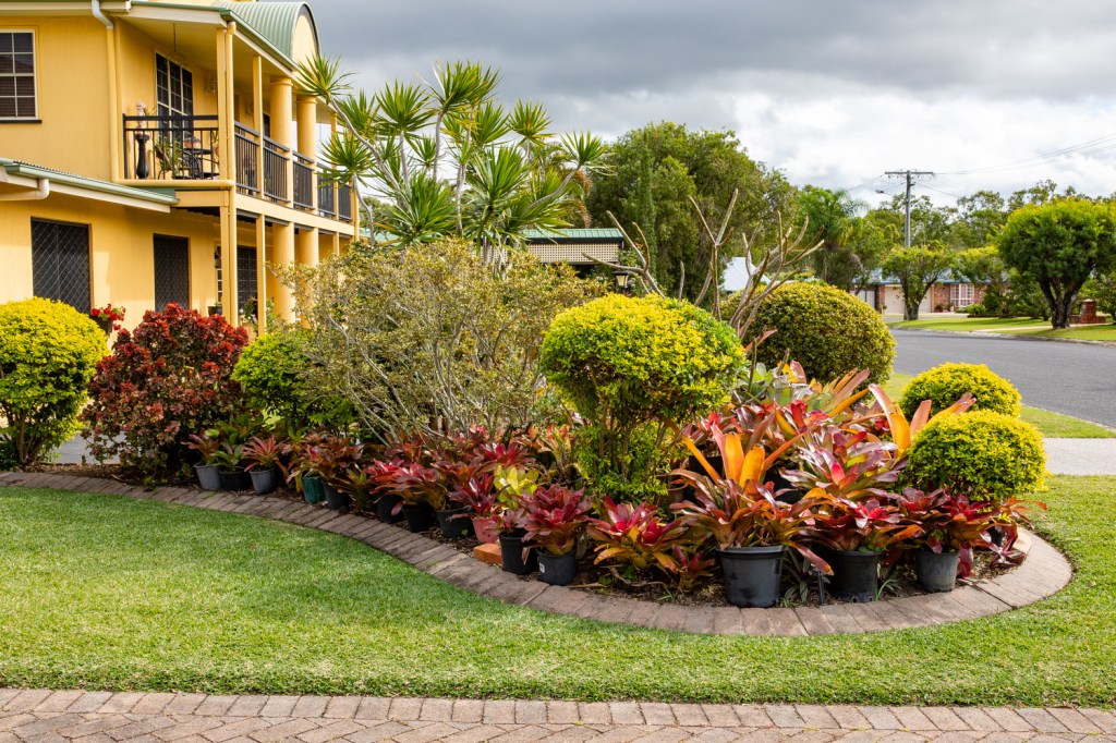This suburban garden is full of potted plants including a large variety of exotic and colourful bromeliads, geraniums and seasonal annuals.